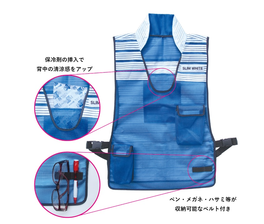 ● 背面上部には、保冷剤が挿入可能なメッシュポケットが付加されており、背中の清涼感がアップします。
