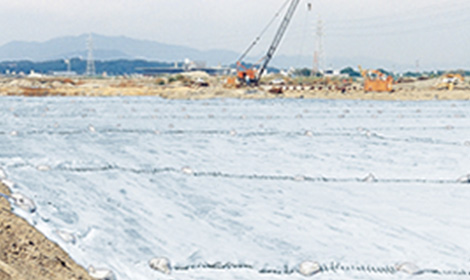 土木シートは埋立工事現場に設置することで軟弱地盤の強化や、海洋へ間仕切りのように設置することで海洋汚染防止に貢献しています。